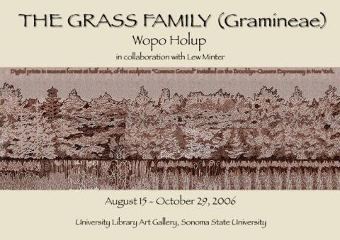 The Grass Family consists of 164 panels which were the result of Holup's 1999 commission by the New York Department of Transporation to create a large-scale public art piece for the Brookly-Queens Expressway (BQE). Holup created Common Ground, a monumental granite scupture covering the expanse of the BQE underpass. It was through the process of transforming original drawings to granite for Common Ground that Holup began experimenting with digital imaging. Her experimentation resulted in the creation of a second art piece, The Grass Family (Gramineae), which in on display in the University Library Art Gallery.