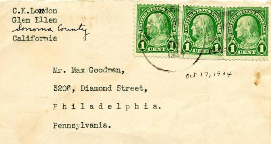 The first letter from Max Goodman is a fan letter in which he expresses his appreciation for Jack London’s writing and his two-volume biography authored by Charmian. The letters detail the economic and political situation in the 1930s. Charmian writes about her need to earn money to buy feed for the Glen Ellen ranch cattle, illness and a serious horse-riding accident that occurred in August 1934. She tells of how three Jack London novels were banned by the Nazis and burned in a bonfire. In Goodman’s final letter to Charmian dated March 13, 1935, he writes about his job search, disillusionment with President Roosevelt and the National Recovery Administration and how he had met the love of his life, Cecelia, who he planned to marry.